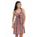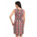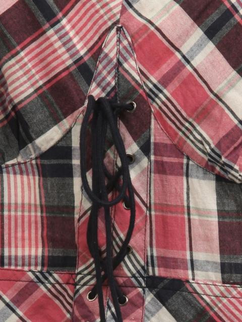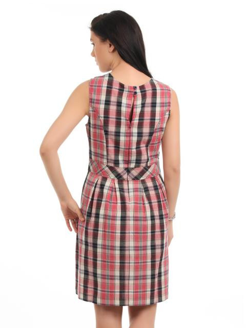 Pink, grey, off white and blue checked, woven, sleeveless dress, has a sweetheart neckline, buttoned closure at the back neckline with a key hole detail below it, double layered at the bust region, criss - cross lace fastening half placket and inverted V pleats below the waist