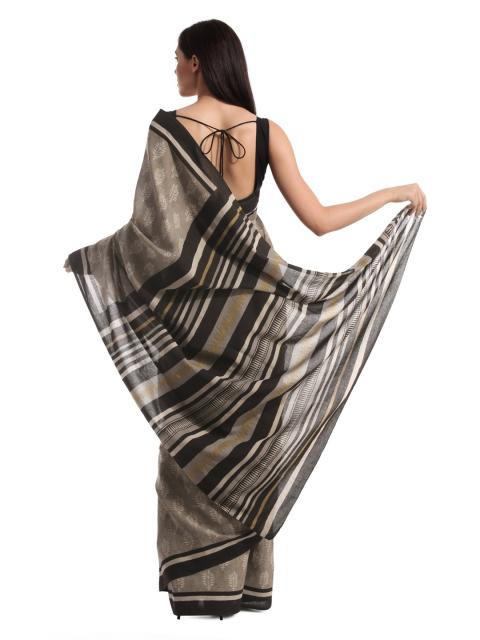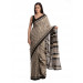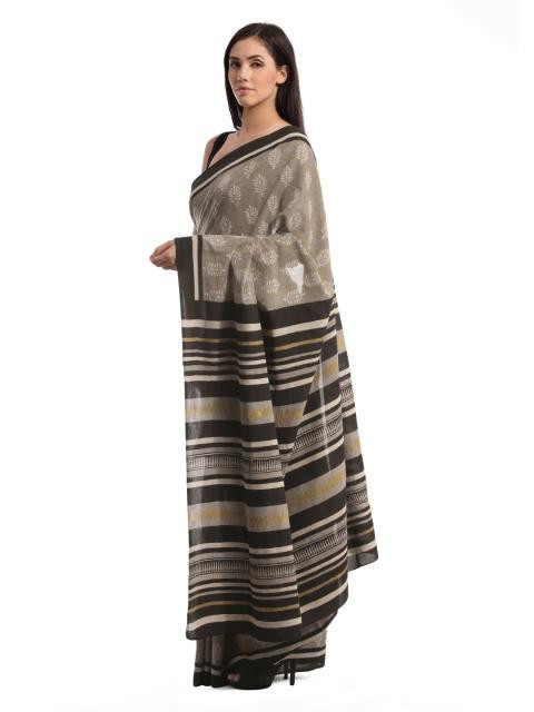 Grey cotton mull hand printed sari with contrast brown details