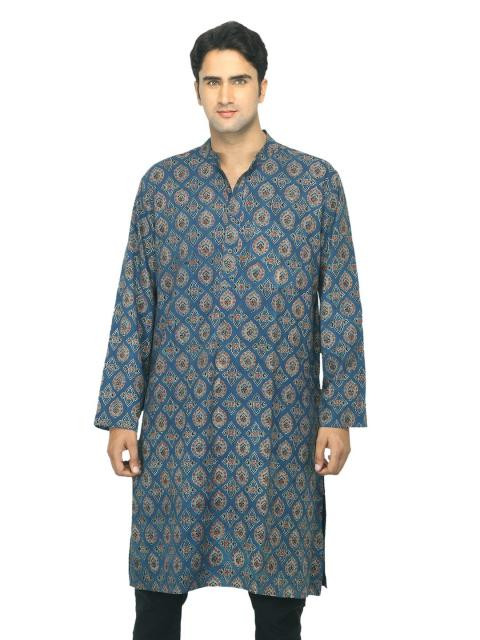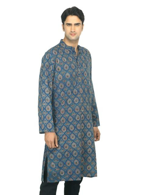 Blue ajrakh print kurta made of 100% cotton, has long sleeves, a mandarin collar with a half buttoned placket, two side pockets and one pocket on the left chest, panel along the sides and a vented hem
