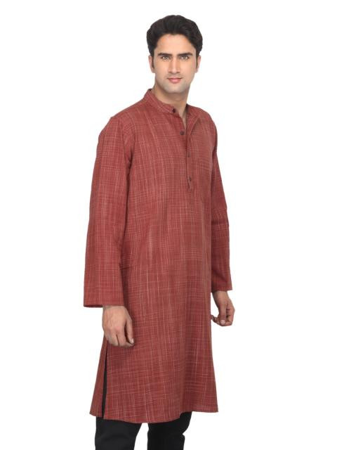 Maroon check patterned kurta made of cotton fabric, has a mandarin collar, half buttoned placket, three quarter sleeve and a vented hem