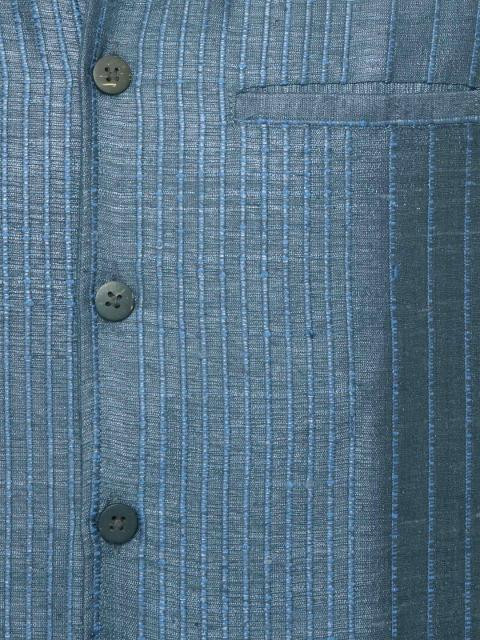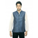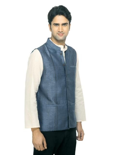 Blue and grey striped sleeveless ethnic jacket made of silk, has a Nehru collar, full buttoned placket, two insert pockets on the sides with a smaller insert pocket on the left chest and a vented hem