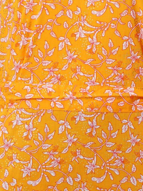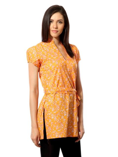 Orange, red and white printed tunic with a mandarin collar and split neckline, made of cotton fabric, has short puffed sleeves and a vented hem