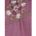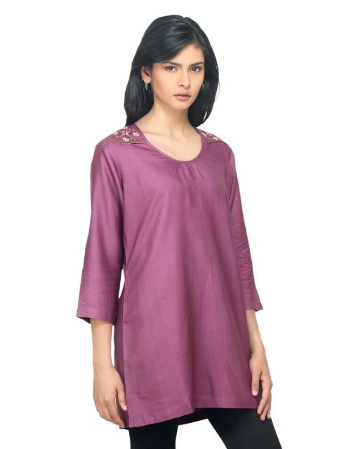 Purple kurti, made of silk, has a round neck, three quarter sleeves, slightly pleated on the front and back, green piping on the shoulders and back and embroidery on the shoulders with glass work
