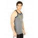 Charcoal melange rib knit sleeveless vest made of 100% premium cotton, has a square neckline, thin shoulder straps with navy blue ribbing and blue piping around the armholes and neckline, distressed look graphic print on the front, printed labelling and brand tab appliqued on the back