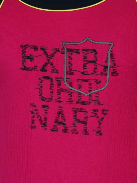 Red rib knit sleeveless vest made of 100% premium cotton, has a square neckline, thin shoulder straps with black ribbing and yellow piping around the armholes and neckline, distressed look graphic print on the front, printed labelling and brand tab appliqued on the back