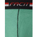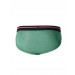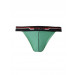 Green string bikini made of poly-cotton no hole plated mesh fabric, has a durable signature logo centered waistband, reinforced fabric covered rubber leg bands, contrast stitch detailing and printed label on the inner