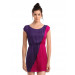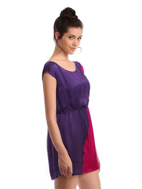 Purple and pink colourblock dress, has short sleeves and elastication at the midriff