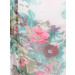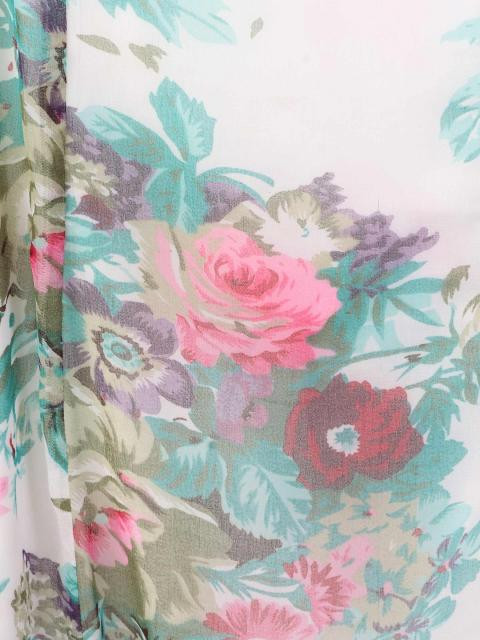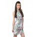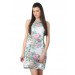 A white dress with colourful floral print, concealed zipper on one side, a round neckline, a buttoned keyhole detail at the nape of the neck, white inner lining, sleeveless and stitched panel in the centre front and back