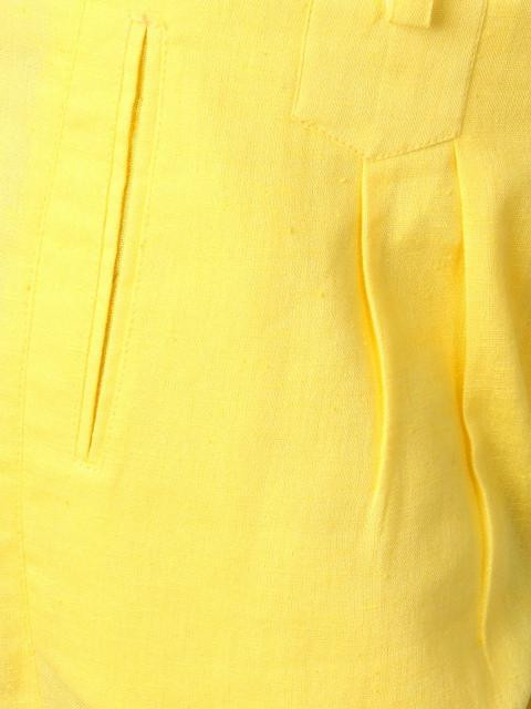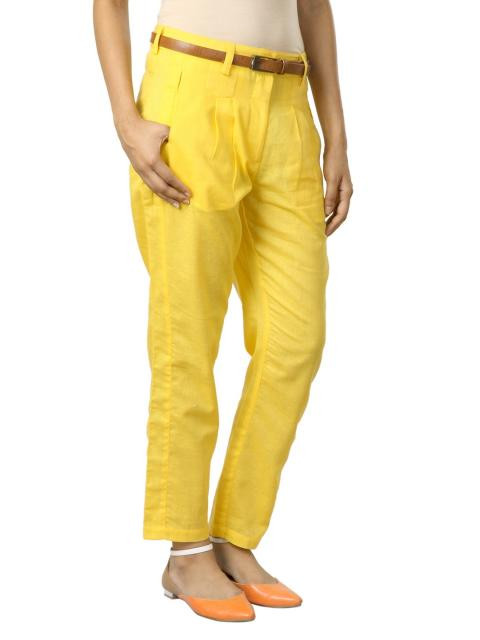 Bright yellow trousers, has a zippered and buttoned closure, two pockets on the sides in front, belt loops at the waist and stitched details and pleats below the waistband in the front.