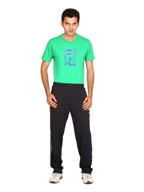 Train better in these black tracks from fila. The soft and broad elasticated waistband sits snug around your waist, while the drawstring allows you to further customize the fit. This cotton track stretches and movees with your body to give you a comfortable feel. Team it with Sports t-shirts and fitness shoes for a great workout session.