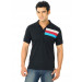 Black polo t-shirt made of 100% cotton, with a ribbed collar and buttoned chest placket, short sleeves with ribbed hems, embroidered brand logo on right sleeve, paneling on chest with coloured panels on the left and brand print on the back neck, brand tab on the left hem and vented hems