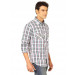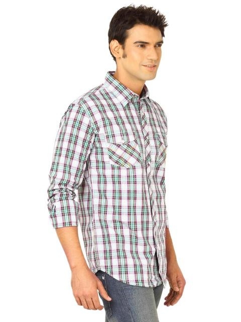 White and green plaid check shirt with purple and yellow accents made of 100% cotton,long sleeves with buttoned placket, two patch pockets on the chest with snap buttoned flaps, snap buttoned placket on the chest, embroidered brand logo over the left chest pocket and curved hemline