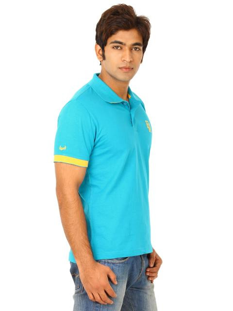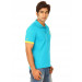 Turquoise green pique polo neck t-shirt made of 100% cotton, that has a ribbed collar and contrast ribbed sleeve hems, tape detailing on the inseam of the collar, buttoned chest placket, embroidered brand name on the left chest and right sleeve, appliqued brand tab on the left hem, huge applique and print combo on the back and vented hems