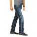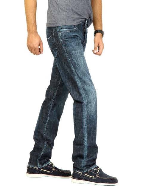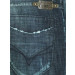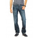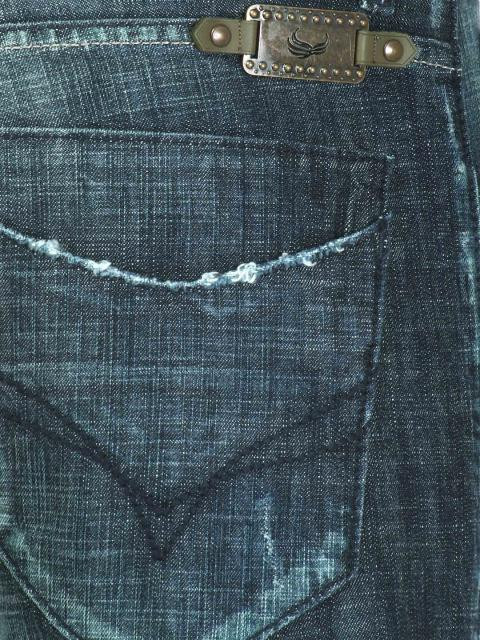 Blue washed jeans made of 100% cotton, has two insert pockets on the front, stud detailing, embroidered brand logo above the left pocket, two patch pockets on the back with stitch detailing, brand name appliqued on the looped waistband, frayed look with patch on the right leg, and has a metal zipper and button closure on the front