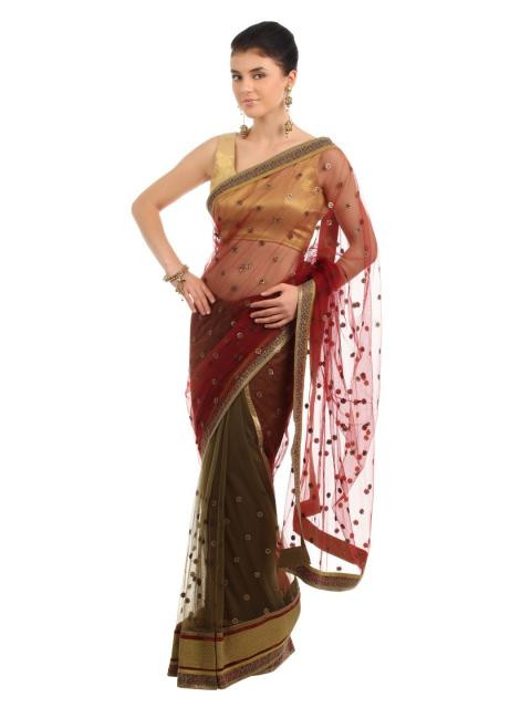 Reddish maroon netted sari with embroidery, has panelling and embroidery at the borders
