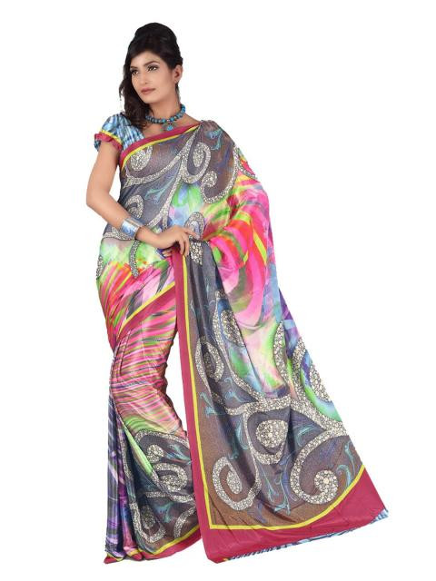 Multi Coloured flowy sari with overtones of grey and has a red border