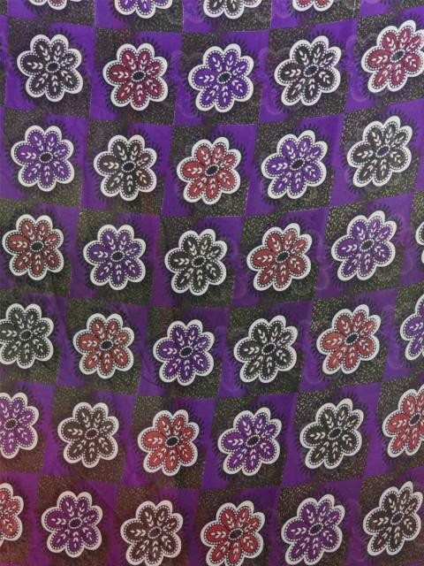 Multi coloured printed sari with purple and pink tape detailing along the borders