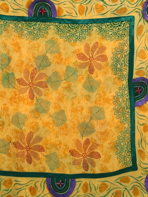 Mustard printed sari, has embroidery and appliqué work on the body of the sari and panelling at the borders