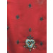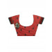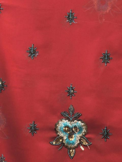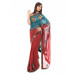 Red jacquard sari with blue and bronze embroidery work, has sequins and zari work