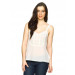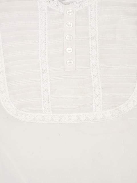 White camisole with a V-neck made of 100% silk with 100% cotton trimmings, sphagetti straps, lace detailing on the neckline with a pintuck and lace bib on the bust, stitched buttons on the bib and a concealed zipper on the side