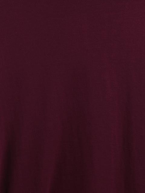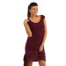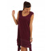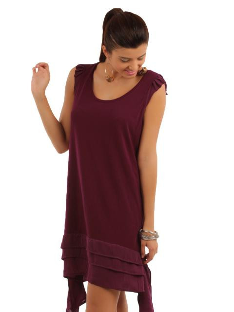 Maroon knitted dress, has a round neck, cap sleeves with ruffles and layering at the hem with extensions