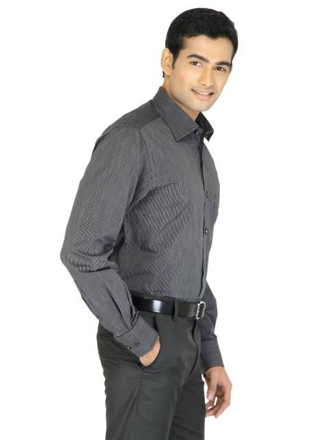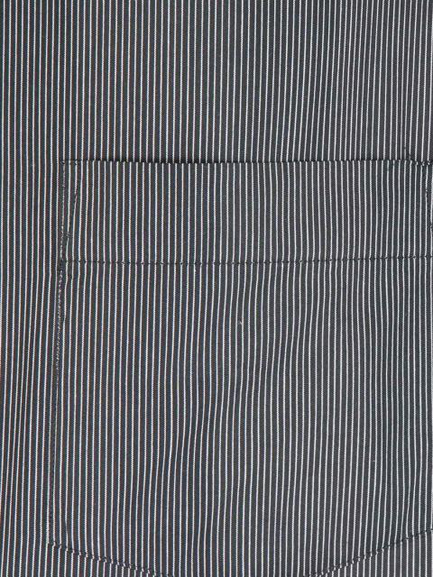 Black striped formal shirt, has a spread collar, full button placket on the front, long sleeves, a patch pocket, curved hem
