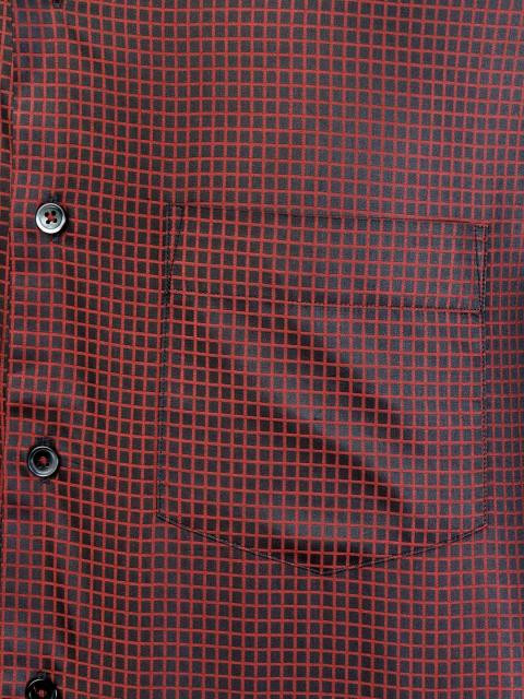 Red and black check shirt made of 100% cotton, has full cuff sleeves, full front button placket with a tipped collar, patch pocket on left chest and a curved hem