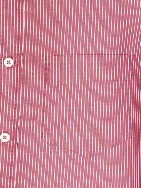 Red and white pinstriped shirt made of 100% cotton, has full cuff sleeves, full front button placket with a tipped collar, patch pocket on left chest and a curved hem