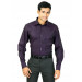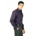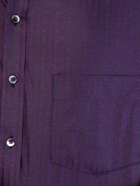 Purple shirt with black pinstripes and light purple polka dots, made of 100% cotton, has a spread collar, long sleeves, butttoned cuffs, full front button placket, patch pocket on left chest and a curved hem