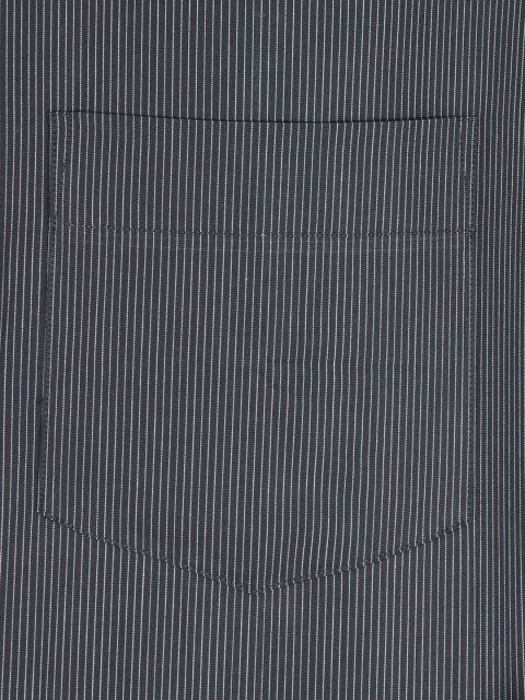 Black shirt with white pinstripes, made of 100% cotton, has full sleeves with buttoned cuffs, tipped collar with buttoned front placket, patch pocket on left chest and a curved hem