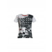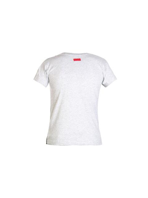 Grey round neck T-shirt, has short sleeves and print and applique on the chest