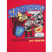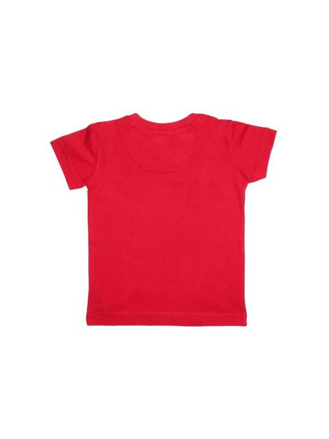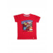 Red round neck T-shirt, has short sleeves and comic themed print on the chest