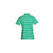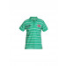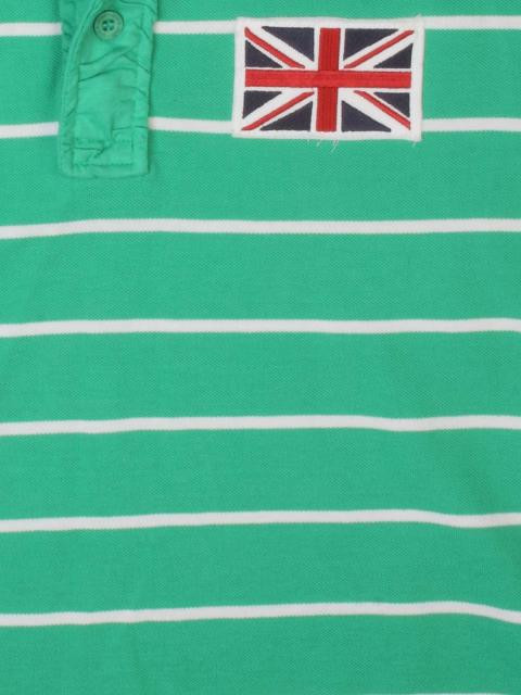 Green and white striped polo T-shirt, has a spread collar, a buttoned placket, short sleeves, embroidery on the right chest and applique on the left and a vented hem