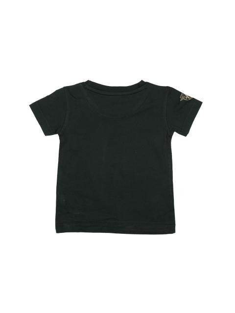 Black round neck T-shirt, has short sleeves and print on the chest