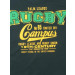 Midnight navy blue round neck T-shirt, has short sleeves, graphic print and appliqué design on the front, and brand tag on the hem