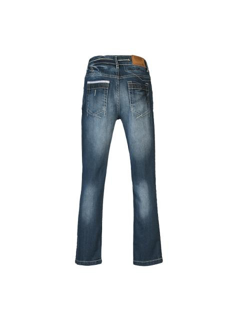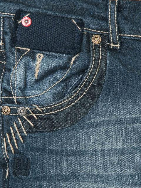 Dark blue faded jeans with a button and zipper closure at the waist, two patch pockets on the front (with applique above the right pocket), two patch pockets at the back and decorative stitch detail below the waist at the back