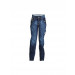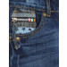 Blue washed denim jeans made of 100% cotton, has two insert pockets on the front with one zipped coin pocket, two patch pockets and one zippered pocket on the back, comfortable waistband with belt loops and brand patch on the waistband at the back, a loop extending from the pocket to the thigh at the back and metal zipper and button closure on the front