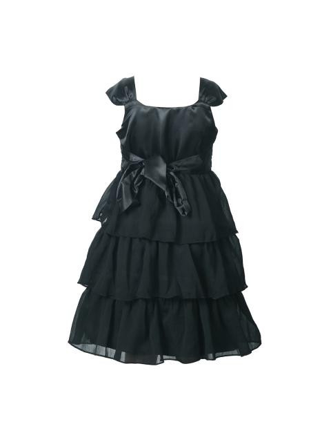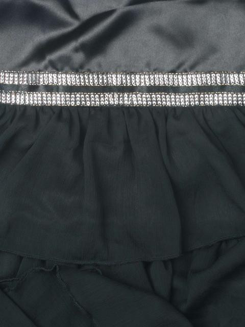 Black strappy dress made of blended satin fabric, has sequin embellishments at the midriff, tiered chiffon ruffles with a satin layer and a cotton lining for comfort and satin belt at the back