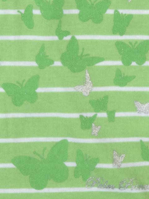 Green round neck top, has ruffled cap sleeves and print on the chest
