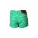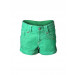 A pair of green denim shorts, has two insert pockets in the front with one small patch pocket above the right pocket, two patch pockets at the back with thread detailing, crystal decorative buttons on the front pockets, foldable hems, elasticized waistband at the back, loops at the waistband for a belt and a zipper and button closure