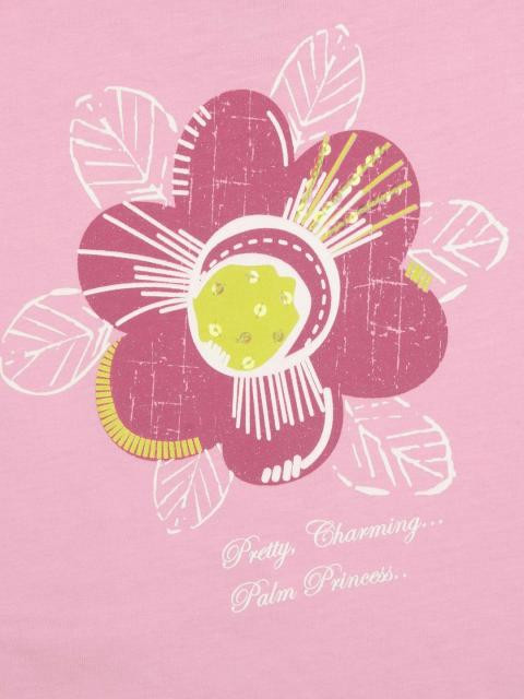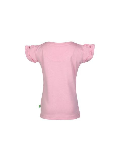 Baby pink with short puffed sleeves which have turn-ups, round neck, has print on the chest with glitter and sequins