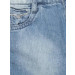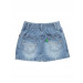Blue washed denim skirt with two side pockets with a coin pocket on the right side, two back pockets with embroidery, button and zippered front closure, has comfortable waistband with belt loops