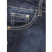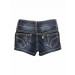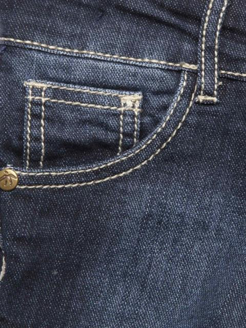 Navy blue washed denim skirt with two side pockets with a coin pocket on the right side, two back pockets, button and zippered front closure, has comfortable waistband with belt loops