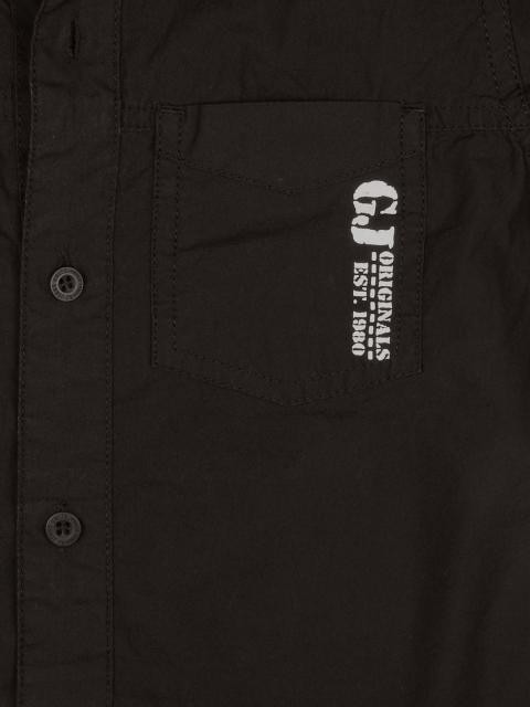 Brown full-sleeve shirt made of 100% cotton, has foldover sleeves with mid-sleeve buttons, tipped collar, stitch detailing above the two pockets on either chest, print on the back and a full length button placket