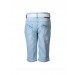 A pair of light blue denim pedal pushers, has two insert pockets in the front with one small patch pocket above the right pocket with colourful thread detailing, two patch pockets at the back with thread detailing, a brand patch appliquéd on the waistband at the back, loops at the waistband for a belt, a white belt and a zipper and button closure