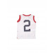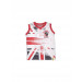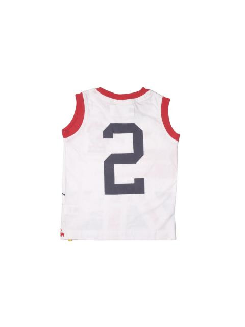 White sleeveless round neck T-shirt has a ribbed collar in contrast colour, graphic print on the front and back, branding appliquéd on the left chest and brand tag on the hem