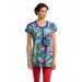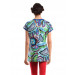 Multi coloured printed tunic, has a round neckline, short sleeves with blue binding and buttoned tab, mock buttoned placket and pin tucks on either side of the placket