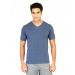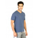 Blue V-neck T-shirt made of 95% cotton and 5% elastane, has a lay flat collar and half sleeves with ribbed wide hems with a brand badge on the left sleeve