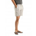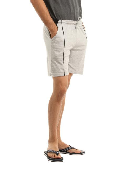 Grey shorts, knit, two slant pockets at side-seam, black piping at front, brand badge on left side seam, elasticized waistband with drawstring