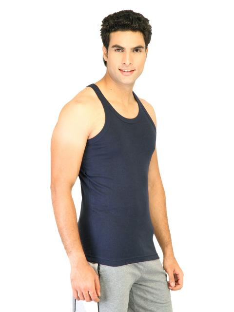 Navy blue sleeveless vest made of ComfortFit 100% combed cotton ribbed fabric, has a round ribbed neck and racer back with a brand badge at the back neck